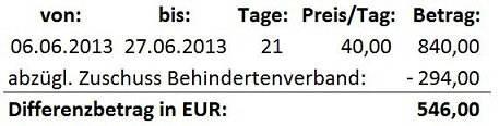 Neben dem von Behindertenverband geleisteten Zuschuss iHv EUR 294,00 habe es seitens der Sozialversicherungsanstalt keinen weiteren Zuschuss gegeben. Der Tagesablauf sei wie folgt gewesen: