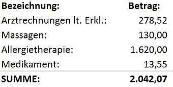 Im vorliegenden Fall ist hingegen dokumentiert, dass der Bf. Handmassagen ("Manuelna masaza") im Gesamtbetrag von EUR 130,00 verabreicht wurden. Diese können - weil gesondert ersichtlich und im Hinblick auf die Schwere der Behinderung sowie den Umstand, dass das Finanzamt auch in den Vorjahren die Kosten für therapeutische Massagen anerkannt hat - als außergewöhnliche Belastung mit Selbstbehalt berücksichtigt werden.