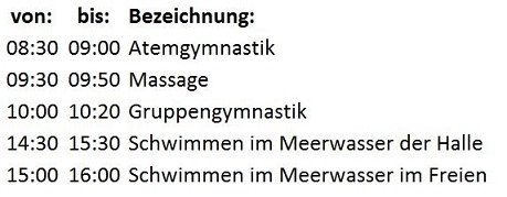 - tägliche Schwimmen im Meerwasser (Halle oder temperaturabhänging im Meer)