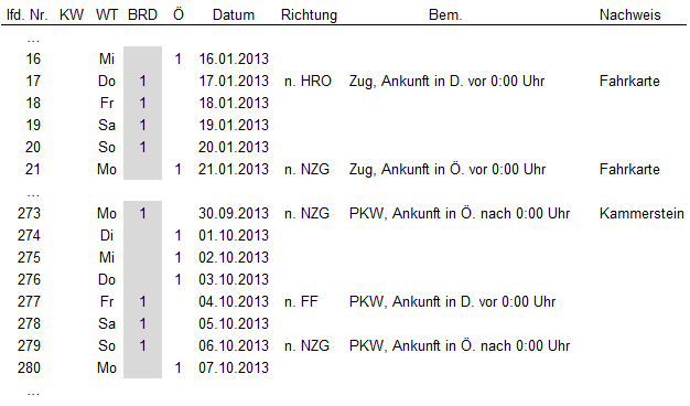 Mit E-Mail vom 11. Dezember 2013 hat der Beschwerdeführer eine aktualisierte, um zusätzliche Angaben (Aufenthaltstage in Österreich, Angabe zur jeweiligen Ankunft in Österreich bzw. Deutschland) ergänzte Auflistung vorgelegt und mitgeteilt, dass für die An- und Abreisetage, wie auch schon in der ursprünglichen Liste, die sowohl für Österreich als auch für Deutschland geltende Regelung hinsichtlich der Datumsgrenze angewendet worden sei.