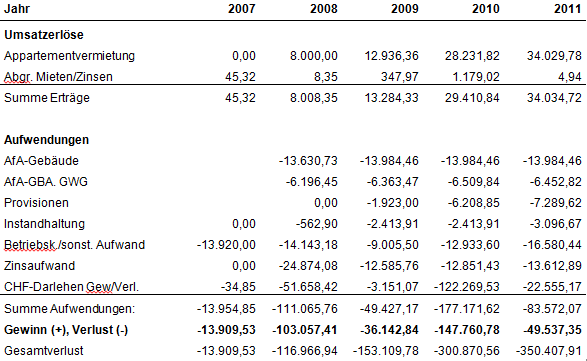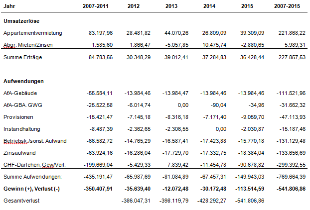 8) Insgesamt kumulierte die Bf – wie aus der obigen Aufstellung zu entnehmen ist - in den Jahren 2007 bis 2015 bei Umsatzerlösen von 227.857,53 € und Aufwendungen von 769.664,39 €, einen Gesamtverlust von 541.806,86 €. Allein die Gebäude-AfA (111.521,96 €), die Betriebskosten (131.129,48 €) und die Provisionen an die Agentur Berghaus (47.113,93 €) von insgesamt 289.765,37 €, die auch in den kommenden Jahren kaum sinken werden, übersteigen die Mieteinnahmen von 227.868,22 € erheblich. Auch bei den Einnahmen ist – wie aus der obigen Aufstellung zu entnehmen ist – eine Steigerung nicht zu erkennen.