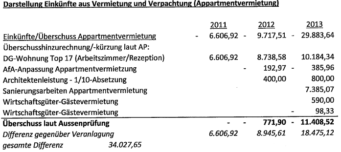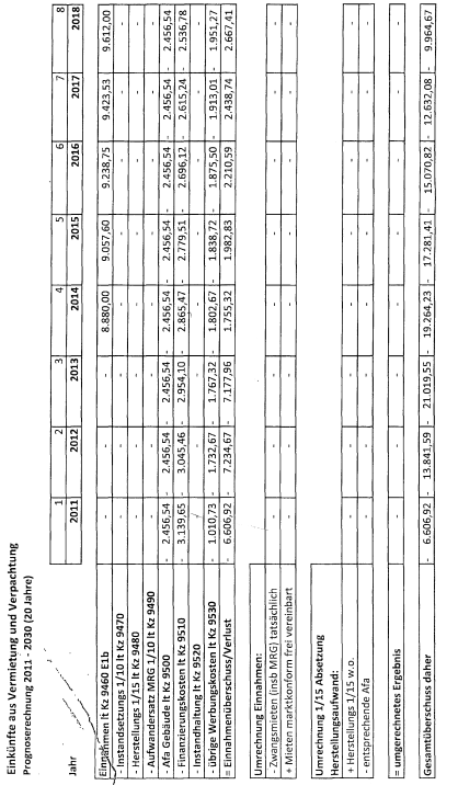 Anmerkung Außenprüfung: Vorlage Prognoserechnung 2011-2013 für Gasse -in Prognoserechnung/Steuererklärung, kein Hinweis auf Kauf der Wohnung im Erdgeschoß bei Einreichung der Steuererklärung 2011- vorgelegte Prognoseberechnung bezieht sich nur auf die Dachgeschoßwohnung und nicht auf die geplante Appartementvermietung.