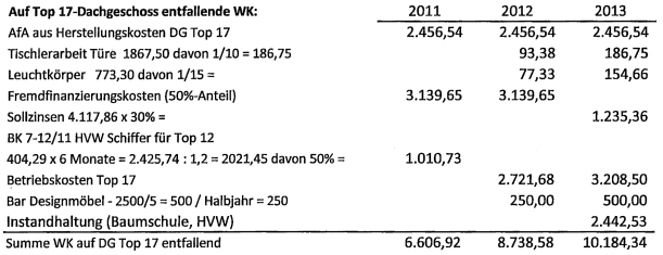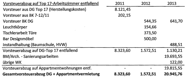 Die bisher geltend gemachten Aufwendungen (vgl. Tz.2) im Zusammenhang mit der Dachgeschoßwohnung Top 17 werden steuerlich nicht als Werbungskosten und die Vorsteuern die auf Top 17-Arbeitszimmer entfallen werden nicht anerkannt.