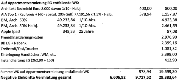 Tz 10 Darstellung Einkünfte aus Vermietung und Verpachtung (Appartementvermietung):
