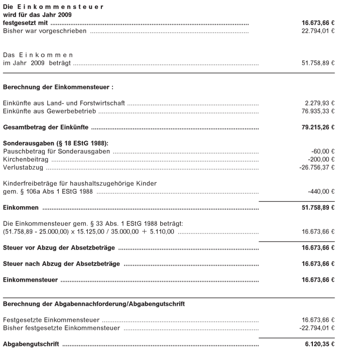 Mit Bescheid vom 22. November 2010 wurde für das Jahr 2009 die Einkommensteuer mit € 22.794,01 festgesetzt. In der Begründung wurde der Verlustabzug/offene Verluste wie folgt dargestellt: