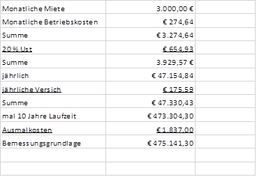 Das Finanzamt begründete, da Umsatzsteuer beurkundet worden sei, sei sie dem Entgelt hinzuzurechnen. Die vom Optionsrecht umfassten Verlängerungszeiten seien bei der Vertragsdauer zu berücksichtigen. € 3.000,00 monatl. Grundmiete + € 359,51 Betriebskosten = € 3.359,51 Gesamtentgelt x 120 (bestimmte + plus unbest. Dauer) = € 483.769,20, plus einmaliger Ausmalkosten € 1.837,00 ergibt eine Bemessungsgrundlage von € 485.606,20.