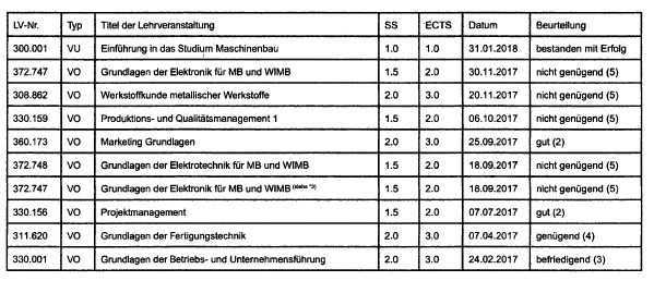 Zu berücksichtigen ist im Fall meines Sohnes auch, dass er im 2. Semester gewillt war den vollen Leistungsnachweis dennoch zu erfüllen und studierte zielstrebig weiter. Nach der letzten einberechneten positiv absolvierten Prüfung vom 25.09.2017 trat er mit 06.10, 20.11. und 30.11.2017 noch zu weiteren Prüfungen an, die er leider nicht bestand.