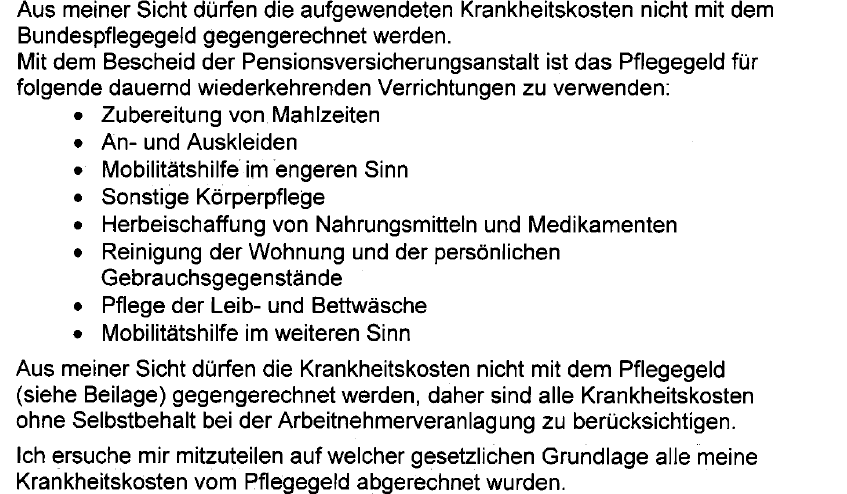 "Von den ursprünglich geltend gemachten Kosten in Höhe von 4.576,67 Euro wurden die Betreuungskosten (2.829,35 €) abgezogen, diese sind mit dem Pflegegeld abgegolten. Somit kommen 2.372,68 Euro als zusätzliche Kosten zum Ansatz."