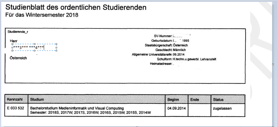 Der Sohn der Bf., geb.***6***1995, begann am 04.09.2014 mit dem Bachelorstudium Medieninformatik und Visual Compulsing (Semester: 2018S, 2017W, 1016W, 2016S, 2015W, 2015S, 2014W).