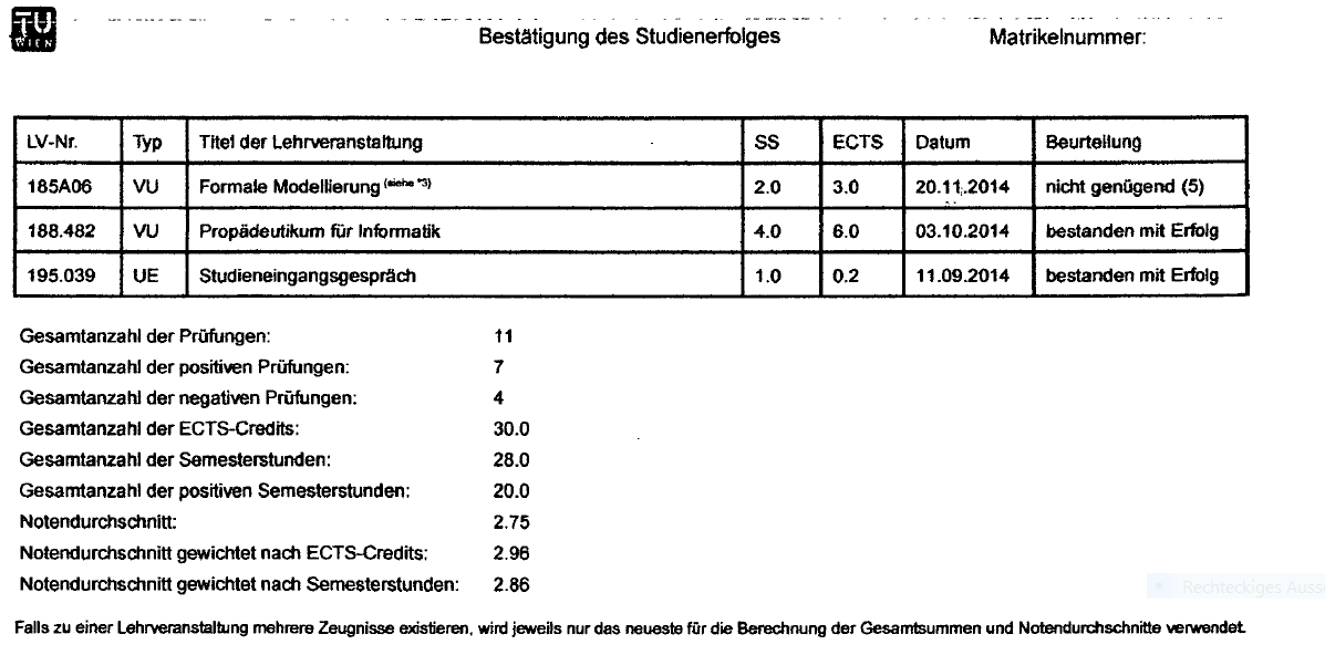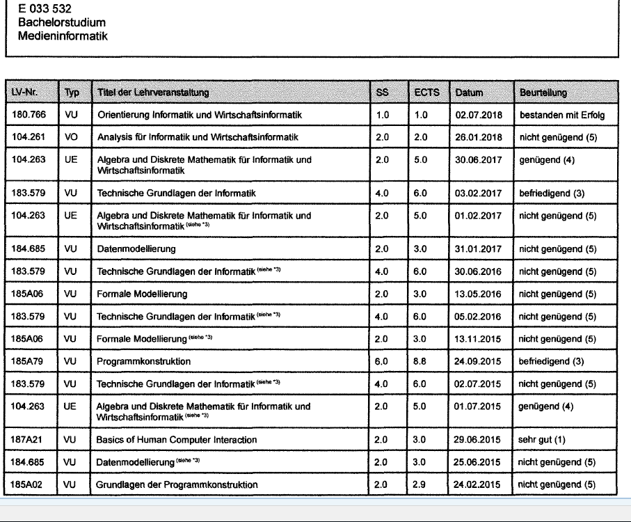 Im 2. Studienjahr 2015/2016 ist der Sohn laut der oa. Bestätigung des Studienerfolges zu vier Prüfungen angetreten: am 13.11.2015, Formale Modellierung, am 05.02.2016 Technische Grundlagen der Informatik, am 13.05.2016 Formale Modellierung und am 30.06.2016 Technische Grundlagen für Informatik, jedoch mit der Beurteilung "nicht genügend".