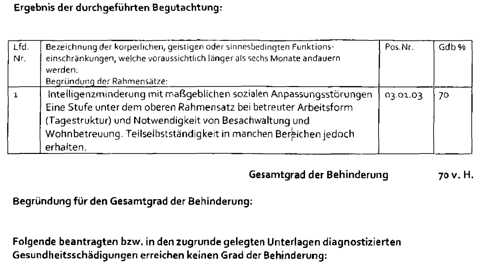 lebt in betreuter WG, Werkstätte der Lebenshilfe, keine Angaben über Einkommen, kein Pflegegeld , keine Erwachsenenenvertretung