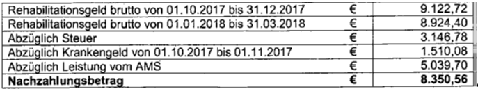 "… Tatsächlich wurde im Einkommensteuerbescheid nicht nur das laufende Rehabilitationsgeld ab April 2018 und die Nachzahlung für die Monate Jänner bis März 2018 berücksichtigt, sondern auch die Nachzahlung, die auf das Kalenderjahr 2017 entfällt.