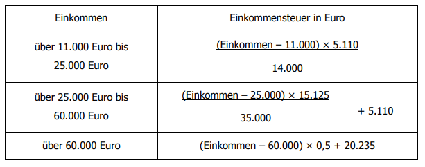 Der Grenzsteuersatz für die € 11.000,00 übersteigenden Einkommensteile beträgt 36,5%, im Bereich von über € 25.000 bis € 60.000,00 liegt er bei 43,21%.