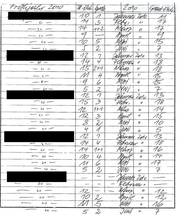 Festgestellt wird, dass es sich bei den mit Eingangsstück E/747-K/14 vorgelegten Anwesenheitslisten um die Original- bzw. Uraufzeichnungen handelt. Diese wurden vom Bf. in den Beschwerdejahren angefertigt. Bis inklusive Juni 2010 wurden händische Aufzeichnungen geführt, aus denen hervorgeht, wie viele Trainingseinheiten und Spiele die einzelnen Spieler pro Monat absolviert haben.