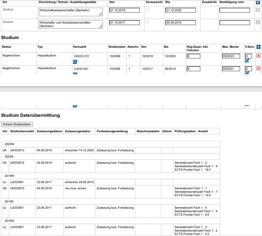 - Studienerfolgsnachweis der Johannes Kepler Universität Linz (JKU Linz) vom 06.12.2020 betreffend das Bachelorstudium Wirtschaftswissenschaften (Studienplan in der Fassung 2018W), aus welcher hervorgeht, dass Lehrveranstaltungen im Ausmaß von 31 ECTS-Punkten an der JKU Linz absolviert wurden und dass an der WU Wien absolvierte Lehrveranstaltungen im Ausmaß von 24 ECTS-Punkten an der JKU Linz angerechnet wurden