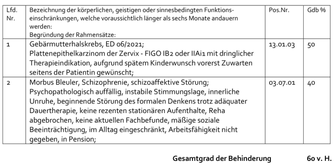 Laut diesbezüglicher Bescheinigung des Bundesamtes für Soziales und Behindertenwesen liegt ein Grad der Behinderung von 60 v.H. seit Juni 2021 bzw 40 v.H. seit Mai 2021 vor.