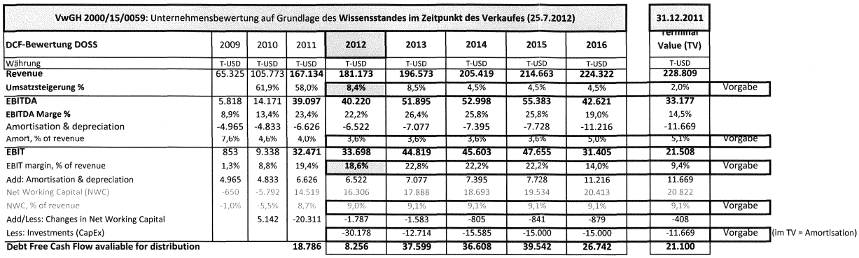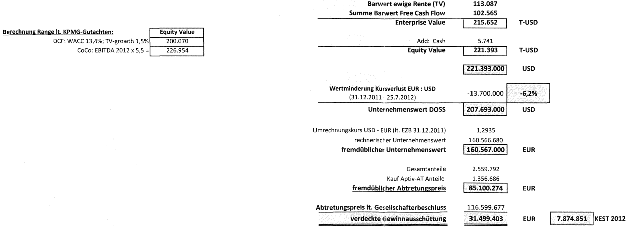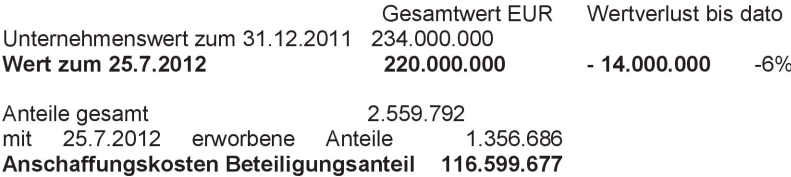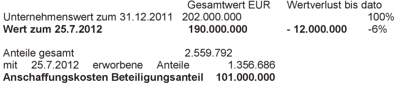 Anlässlich des konzerninternen Verkaufes am 25.7.2012 wurde daher der Abtretungspreis von der Verkäuferin auf Basis eines DCF-Gutachtens zum 31.12.2011 festgelegt: