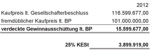 Die GBP qualifiziert die Differenz zwischen dem vermeintlich fremdüblichen Kaufpreis und dem Kaufpreis laut Bewertungsgutachten (und somit laut Gesellschafterbeschluss) als verdeckte Gewinnausschüttung der ***Bf1*** an die Muttergesellschaft ***MN***.