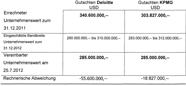 Die beauftragten Wirtschaftsprüfungsgesellschaften ermittelten eine ähnliche Bandbreite für den Unternehmenswert der ***AB***. Konkret berechnete KPMG einen Unternehmenswert zwischen USD 283 Mio. und USD 312 Mio.; die Berechnungen von Deloitte ergaben hingegen einen Unternehmenswert zwischen USD 260 Mio. und USD 310 Mio. Basierend auf den entsprechenden Bewertungsgutachten kamen die ***EF*** als Veräußerer und die ***Bf1*** als Erwerberin überein, dass der Unternehmenswert für 100% der Anteile an der ***AB*** bei USD 285 Mio. (EUR 220 Mio.) liegen würde. Schließlich erwarb die ***Bf1*** für einen Abtretungspreis in Höhe von EUR 116,6 Mio. ***AB***-Anteile im Ausmaß von 52,99%.