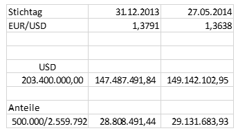 Bei einem Unternehmenswert in USD in Höhe von 203,04 Millionen ergibt dies für die knapp 20%-Beteiligung folgende Euro-Beträge: