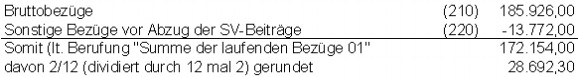 Die so ermittelte Summe wurde durch 9 dividiert und mit 2 multipliziert und ergibt so den unter Kz 220 ausgewiesenen Betrag von ATS 13.772. Zum gleichen Ergebnis kommt man, wenn man den durchschnittlichen Monatsbezug mit 12 multipliziert, diesen somit auf einen ganzen Jahresbezug umrechnet, und davon ein Sechstel ermittelt. Da die im September angewiesene Sonderzahlung diesen Betrag überstieg, wurde der übersteigende Betrag als laufender Bezug versteuert.
