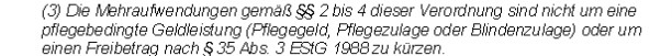 - Mehraufwendungen aus dem Titel der Behinderung sind und der Steuerpflichtige selbst oder bei Anspruch auf den Alleinverdienerabsetzbetrag der (Ehe)Partner (§ 106 Abs. 3) oder bei Anspruch auf den Kinderabsetzbetrag oder den Unterhaltsabsetzbetrag das Kind (§ 106 Abs. 1 und 2) pflegebedingte Geldleistungen (Pflegegeld, Pflegezulage, Blindengeld oder Blindenzulage) erhält, soweit sie die Summe dieser pflegebedingten Geldleistungen übersteigen.