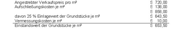 Aufgrund meiner Erkundigungen hat sich herausgestellt, dass sehrwohl dann 25 % Differenz zwischen Baulandverkaufspreis und Einlagewert bzw. Ankauf von Ackergrundstücken für Parzellierungen gewählt werden können, wenn im Verkaufspreis die Aufschließungskosten enthalten sind und außerdem der Verkaufspreis nicht für alle Grundstücke fix und gleich ist.