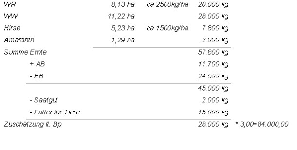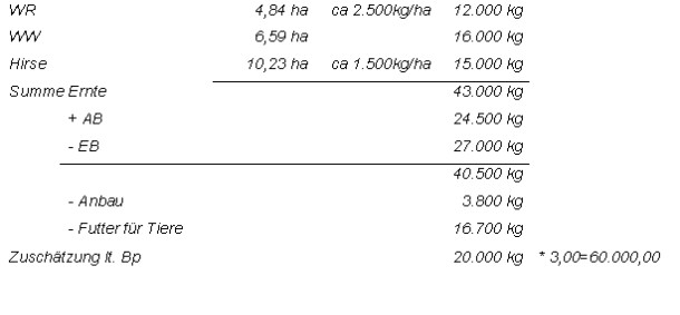 Lt. Niederschrift/Erhebung (3. Juli 2001) hat der Bw. 2001 5,23 Ha Roggen und 19,88 Ha Weizen angebaut, rechnet mit einem Ertrag von ca. 2 - 3.000 kg/Ha und wird die gesamte Ernte 2001 verkaufen, da aus dem Jahr 2000 noch genügend Hirse zu Futterzwecken vorhanden ist. Im Jahr 1998 ist die gesamte Ernte durch Hagelschlag vernichtet worden; der Bw. hat das geerntete Getreide (ca. 5.000 kg) zur Gänze verfüttert.