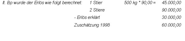 Im Oktober 1998 hat mein Mandant einen Stier geschlagen und somit zum 31.12.1998 in der Inventur nur mehr vier Stück ausgewiesen.