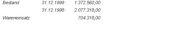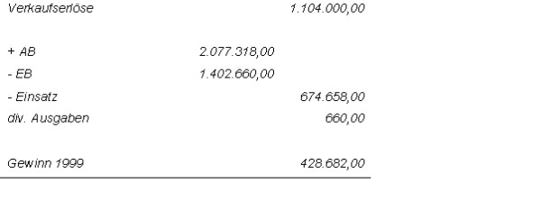 Der Wareneinsatz wurde mit 75% des Verkaufswertes zuzüglich der anteiligen Planungskosten festgesetzt. (Von den gesamten Verkäufen bis einschließlich des Jahres 2000 wurde ein durchschnittlicher Preis pro m² errechnet und als Grundlage herangezogen.)