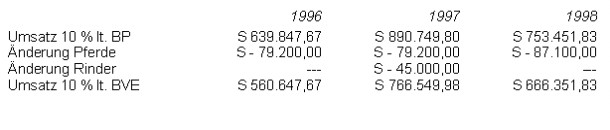Lt. Tz 17 des Bp-Berichtes beträgt die Umsatzhinzurechnung (10%): ATS 278.000,00 (1996), ATS 298.000,00 (1997) und ATS 302.000,00 (1998).