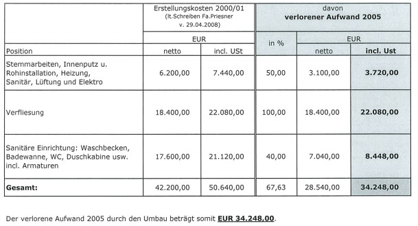 Der Bw. legte mit e-mail vom 9. Mai 2008 eine Aufstellung bezüglich des verlorenen Aufwands 2005 für Bad und WC, eine Bestätigung der ursprünglichen Errichtungskosten für Bad und WC von Fa. P. vom 29. April 2008 und ein Angebot Bad / WC Fa. S. vom 2. Dezember 2005 vor.