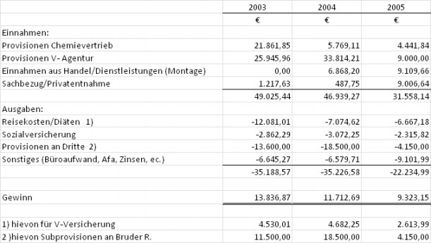 Die durch Einnahmen-Ausgabenrechnung ermittelten Einkünfte aus Gewerbebetrieb betrugen im Jahr 2002 (Verlust) € 528,00; im Jahr 2003 (Gewinn) € 13.836,87; im Jahr 2004 (Gewinn) € 11.712,69 und im Jahr 2005 (Gewinn) € 9.323,15. Die Bruttoeinnahmen betrugen im Jahr € 2003 rund 48.000,00, im Jahr 2004 € 46.500,00 und im Jahr 2005 rund € 22.500,00.