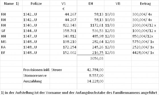 Für die Vermittlung dieser Verträge wurden von der V-Agentur im Jahr 2004 € 34.228,00 ausbezahlt (und darüber hinaus Stornoreserven iHv € 8.557,00 zurückbehalten).