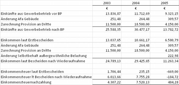 (3) Vom Finanzamt wurden mit Bescheiden vom 10. Dezember 2008 die Verfahren betreffend Einkommensteuer 2003 bis 2005 gemäß § 303 Abs. 4 BAO wieder aufgenommen und ebenfalls mit 10. Dezember 2008 geänderte Einkommensteuer entsprechend den nachstehenden im Betriebsprüfungsbericht dargestellten Korrekturen erlassen: