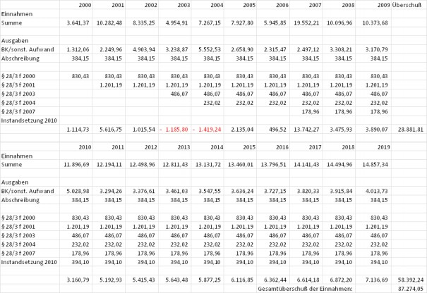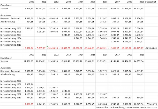 Ohne Umrechnung der Instandsetzungsaufwendungen auf eine "Normal-AfA" ergibt sich sohin in einem 20-jährigen Zeitraum nach dieser Berechnung ein Gesamtüberschuss der Werbungskosten über die Einnahmen in Höhe von € 54.237,85.