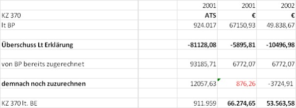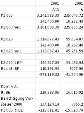Ebenso sind bei den Umsätzen die Mieterlöse des Jahres 2001 um den Betrag von ATS 141.490 (€ 10.282,48) zu reduzieren.