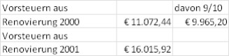 Als Berechnungsgrundlage werden 50 % der Vorsteuerbeträge 2000 und 2001 herangezogen, welche die Renovierungsarbeiten betreffen.