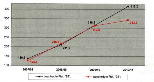 Die Praxis des Bundes bei der definitiven Genehmigung der Anzahl der für die Erreichung des Zieles der Klassenschülerzahl von 25 dem Land Salzburg zur Verfügung gestellten Vollzeitäquivalenten lässt einen im letzten Umsetzungsjahr 2010/11 sachlich nicht nachvollziehbaren, einseitig gesetzten Bruch erkennen, der auch unter dem Gesichtspunkt des im Rahmen des verfassungsrechtlich gewährleisteten Gleichheitsgrundsatzes verbürgten Vertrauensschutzes zu bewerten ist. Diese Praxis darf zur Erhöhung der Übersichtlichkeit und zur leichteren Nachvollziehbarkeit in Form einer Grafik sowie in der angeschlossenen Beilage 32 zusätzlich tabellarisch dargestellt werden: