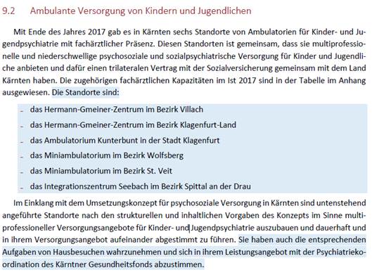 Soweit die Planung der psychosozialen Versorgung nach §1 Abs1 Z3 iVm Anlage 1 Punkt 9 der Verordnung betroffen ist, ist im Hinblick auf die verbindlichen (jeweils blau hinterlegten) Teile aus dem Regionalen Strukturplan Gesundheit – Kärnten 2025 nicht ersichtlich, dass darin bundesgesetzliche Vorschriften durchgeführt werden, die ihre Grundlage in Art10 B‑VG hätten (siehe bereits oben in Abschnitt II.2.). Vielmehr haben die strukturellen Vorgaben unter den Punkten 9.1 und 9.2 der Anlage 1 jeweils die Standorte und die Zahl der Ambulatorien iSv §2 Z5 und §13 K-KAO zur Versorgung von Erwachsenen bzw von Kindern und Jugendlichen zum Gegenstand, während sich die Regelung zur Durchführung von Hausbesuchen durch die Ambulatorien auf §2 Z5 letzter Satz und §13 Abs7 K-KAO stützt (vgl auch die Grundsatzbestimmungen des §2 Abs1 Z5 letzter Satz und §3a Abs7 KAKuG).