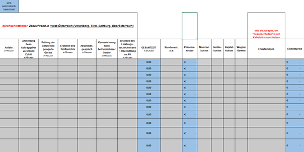 Das heißt, es ist insbesondere darzustellen, wie hoch die durchschnittlichen Zeitaufwände der einzelnen Tätigkeiten im Zuge der Überprüfung sind, wie hoch der Stundensatz der prüfenden Person ist, welche Material-, Geräte-, und Kapitalkosten enthalten sind, und welche Deckungs-beiträge bzw. Gewinnaufschläge berücksichtigt wurden. Der so aufgeschlüsselte Preis muss dem angebotenen Einheitspreis entsprechen.