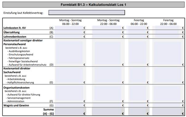 Sollte sich herausstellen, dass die präsumtive Bestbieterin den Stundenlohn beispielsweise für Nachtdienste Montag bis Sonntag, 22:00 — 06:00 Uhr mit einem geringeren Betrag als EUR 11,35 pro Stunde kalkuliert habe, widerspreche das Angebot der präsumtiven Bestbieterin der Ausschreibung und wäre auch aufgrund dessen auszuscheiden gewesen.