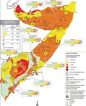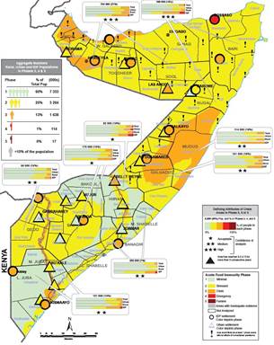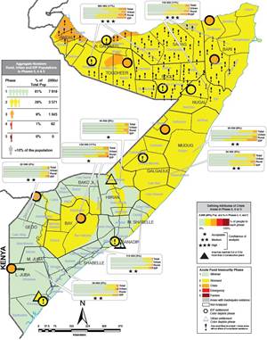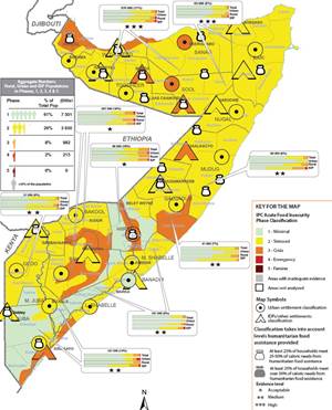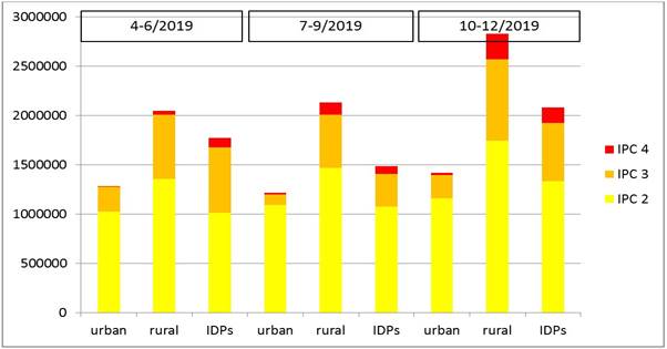 In Agrargebieten von Guban (Somaliland), Bay und Bakool sowie in Teilen von Hiiraan, Galgaduud, Lower und Middle Juba gilt IPC 3. Dahingegen haben stabile Lebensmittelpreise und Arbeitsmöglichkeiten in den meisten städtischen Gebieten dazu beigetragen, dass IPC 2 nicht überschritten wurde oder auch nur IPC 1 gilt. Lediglich in Städten in Sool, Sanaag und Hiiraan wird mitunter auch IPC 3 verzeichnet – bedingt durch hohe Lebenskosten und begrenzte Einkommensmöglichkeiten (FEWS 2.9.2019a).
