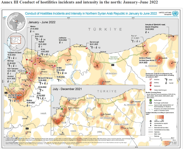 Im Nordwesten Syriens führte das Vordringen der Hay'at Tahrir ash-Sham (HTS) in Gebiete, die unter Kontrolle der von der Türkei unterstützten Gruppen standen, zu tödlichen Zusammenstößen. Russland verstärkte seine Luftangriffe in Idlib, und die Türkei griff kurdische und Regimekräfte an. Russland setzte die Bombardierungen in der Provinz Idlib am 7., 11. und 17.10.2022 fort und belastete damit den Waffenstillstand vom März 2020 (ICG 10.2022).