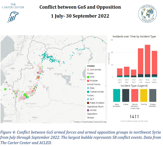 Aus dem Nordwesten Syriens wurde eine deutliche Zunahme der konfliktbezogenen Aktivitäten gemeldet: Die Streitkräfte der Regierung setzten verstärkt Artilleriebeschuss ein. Im 3. Quartal 2022 verzeichnete ACLED 1.412 Konfliktfälle zwischen den Streitkräften der Regierung und ihren Verbündeten und den bewaffneten Oppositionsgruppen. Dies ist ein deutlicher Anstieg (+225 %) gegenüber den 434 Konflikten, die im zweiten Quartal verzeichnet wurden. Die Streitkräfte der syrischen Regierung waren an insgesamt 708 von 1.265 Beschussereignissen beteiligt. Trotz dieses massiven Anstiegs gibt es kaum Anzeichen dafür, dass sich die zugrundeliegende Dynamik zwischen der Regierung und der Opposition verändert hat. Der Beschuss scheint vielmehr der Grund für das Ausbleiben militärischer Aktionen zu sein und die Gegner an den Fronten zu zermürben (CC 03.11.2022).