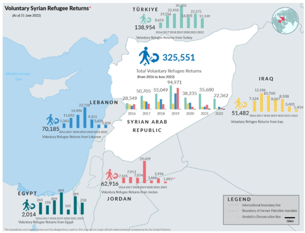 Gemäß UNHCR kehrten im Zeitraum 2016-30.06.2022 insgesamt 325.551 syrische Flüchtlinge selbstorganisiert aus der Türkei, dem Libanon, Jordanien, dem Irak, Ägypten und anderen nordafrikanischen Ländern nach Syrien zurück. Bei den gemeldeten Zahlen handelt es sich nur um die vom UNHCR überprüften oder überwachten Zahlen, die nicht die Gesamtzahl der Rückkehrer widerspiegeln, die wesentlich höher sein könnte. Nachstehend können graphische Darstellungen zur Verteilung der Anzahl an Rückkehrern im zeitlichen Verlauf sowie nach Ausgangsland entnommen werden (Aktualisierungsstand 30.06.2022):