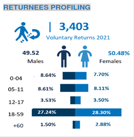 Gemäß den Erhebungen von UNHCR waren 27,24 % der Rückkehrer und 28,3 % der Rückkehrerinnen, welche von UNHCR erfasst wurden, zwischen 18 und 59 Jahren alt, wobei UNHCR insgesamt 3.403 freiwillige Rückkehrer zählte [s. graphische Darstellung in der Originalquelle, Anm.].