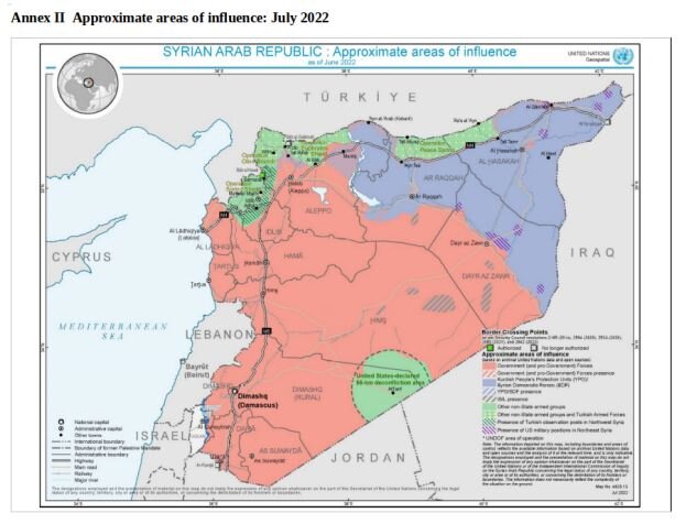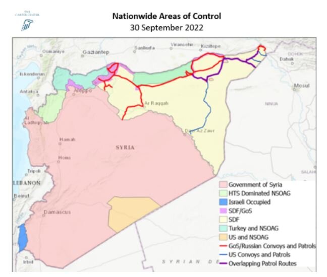 Mit Stand Dezember 2022 befinden sich die Gouvernorate al-Hassakah und Ar-Raqqa sowie Teile von Deir Ez-Zor nördlich des Flusses Euphrat und Teile des Gouvernements Aleppo um Manbij und Kobanê sowie das Gebiet um Tal Rifa'at unter der Kontrolle der kurdisch geführten SDF [auch Autonomous Administration of North and East Syria – „AANES“].