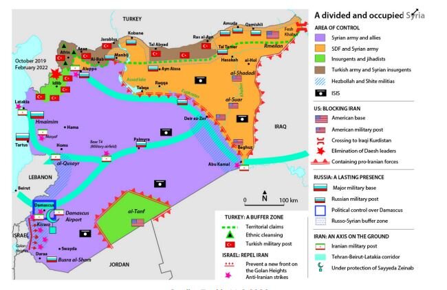 Die folgende Karte zeigt die verschiedenen internationalen Akteure und deren militärische Interessenschwerpunkte in Syrien: