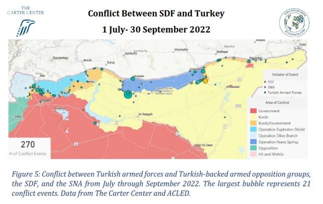 ACLED registrierte im dritten Quartal 2022 270 Konfliktfälle zwischen verschiedenen kurdischen bewaffneten Gruppen und türkischen Streitkräften oder von der Türkei unterstützten Oppositionsgruppen. Dies ist ein Rückgang um 30 % im Vergleich zum letzten Quartal. Der Rückgang erfolgte trotz der Rhetorik und der Besorgnis über einen neuen türkischen Einmarsch in Nordsyrien. Die Zahl der türkischen Drohnenangriffe ist weitgehend gleich geblieben (28 Ereignisse im zweiten Quartal und 29 im dritten Quartal). Die Angriffe beschränkten sich jedoch nicht mehr auf die Frontlinien, wo die überwiegende Mehrheit der Zusammenstöße und Beschussereignisse stattfinden; im Juli und August 2022 schlugen türkische Drohnen auf Ziele in den wichtigsten von den SDF kontrollierten städtischen Zentren und töteten Gegner (und Zivilisten) in Manbij, Kobani, Tell Abyad, Ar-Raqqa, Qamishli, Tell Tamer und al-Hassakah.